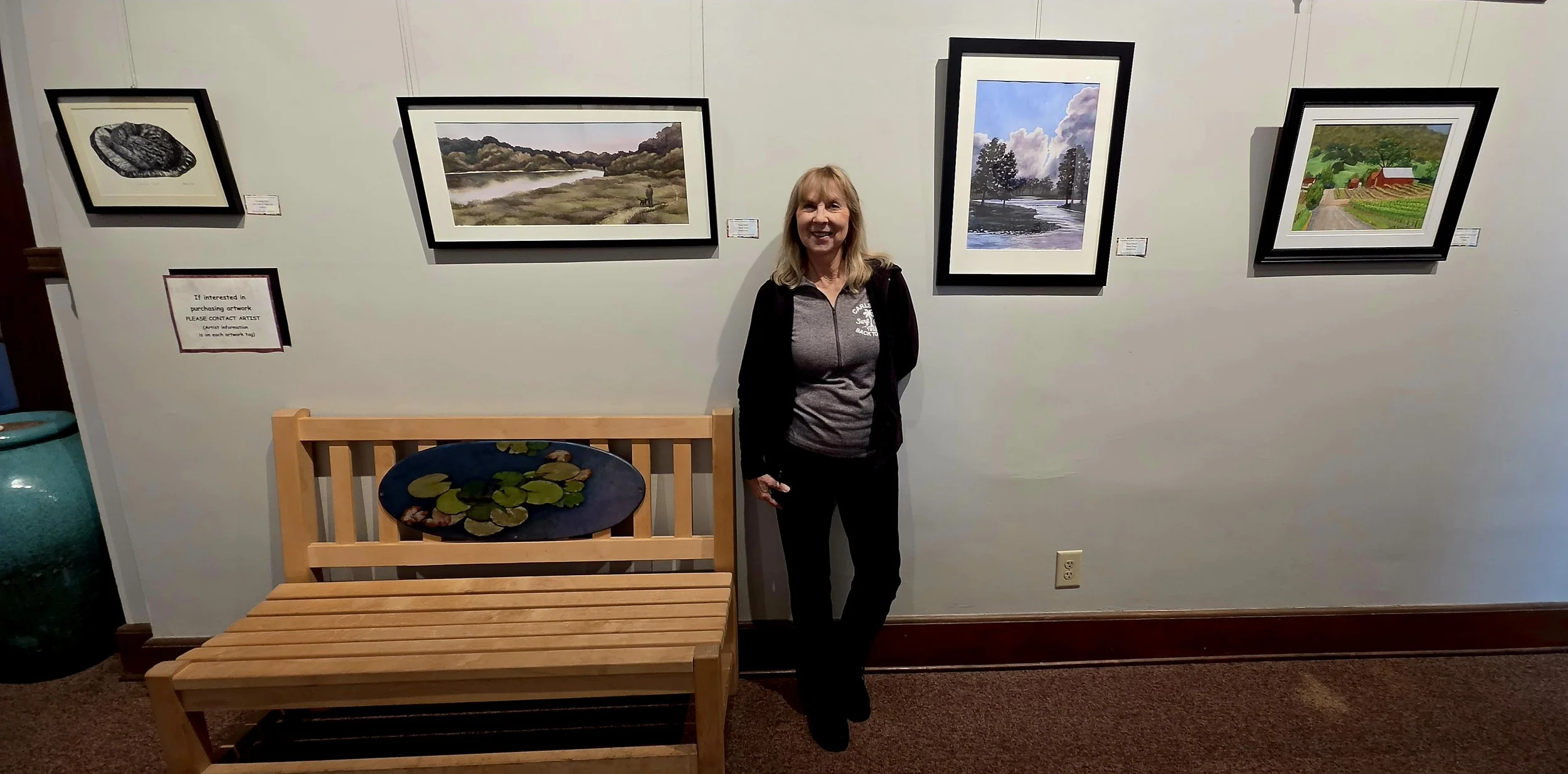 Diane Tharp standing between her two watercolors.
