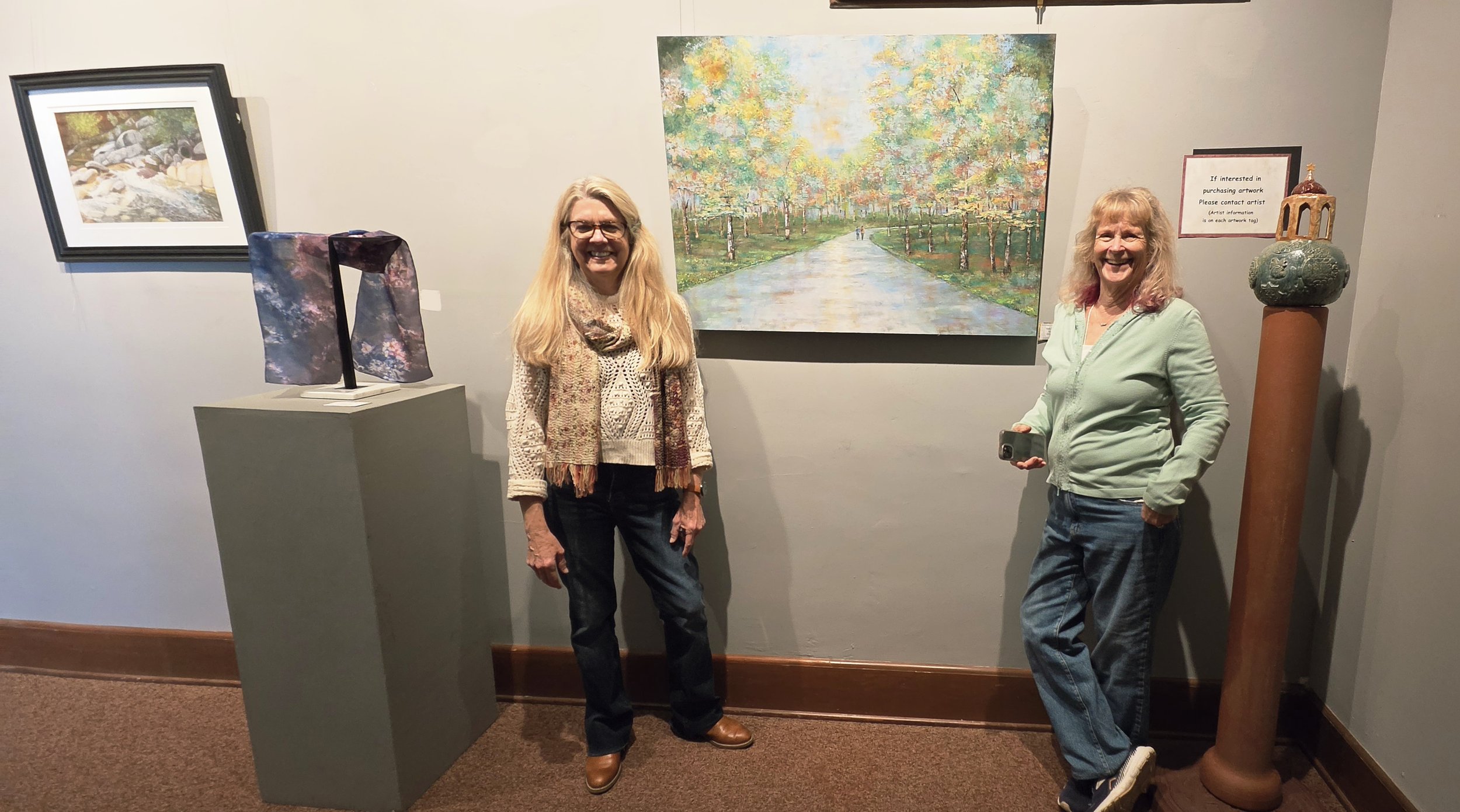 Barbara Ann Chestnutt with her ceramic piece and Kathy Sinclair and her oil and cold wax painting.